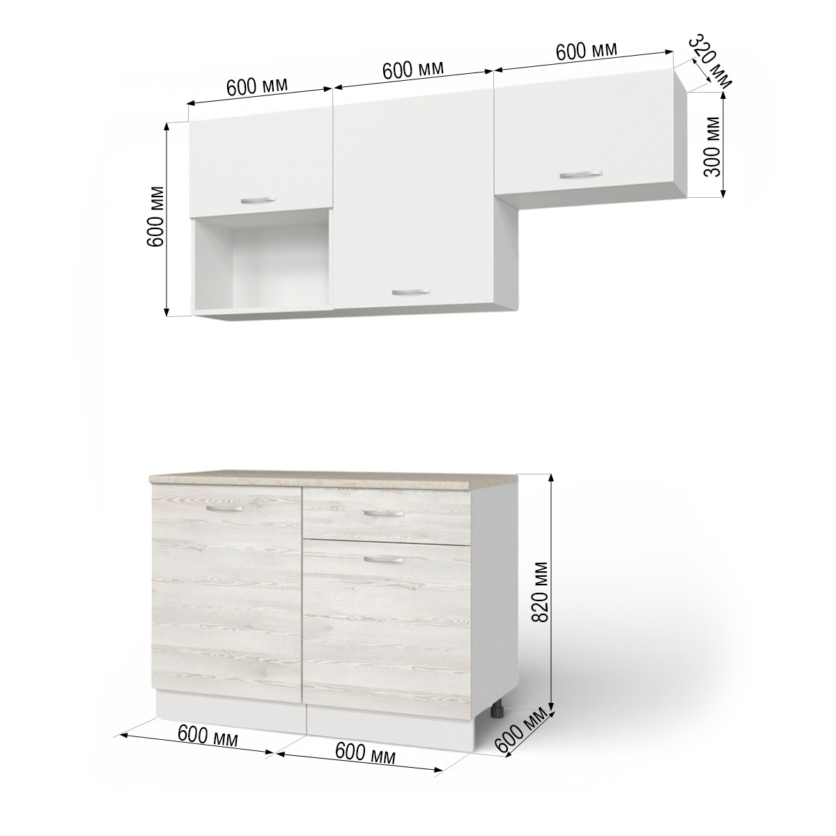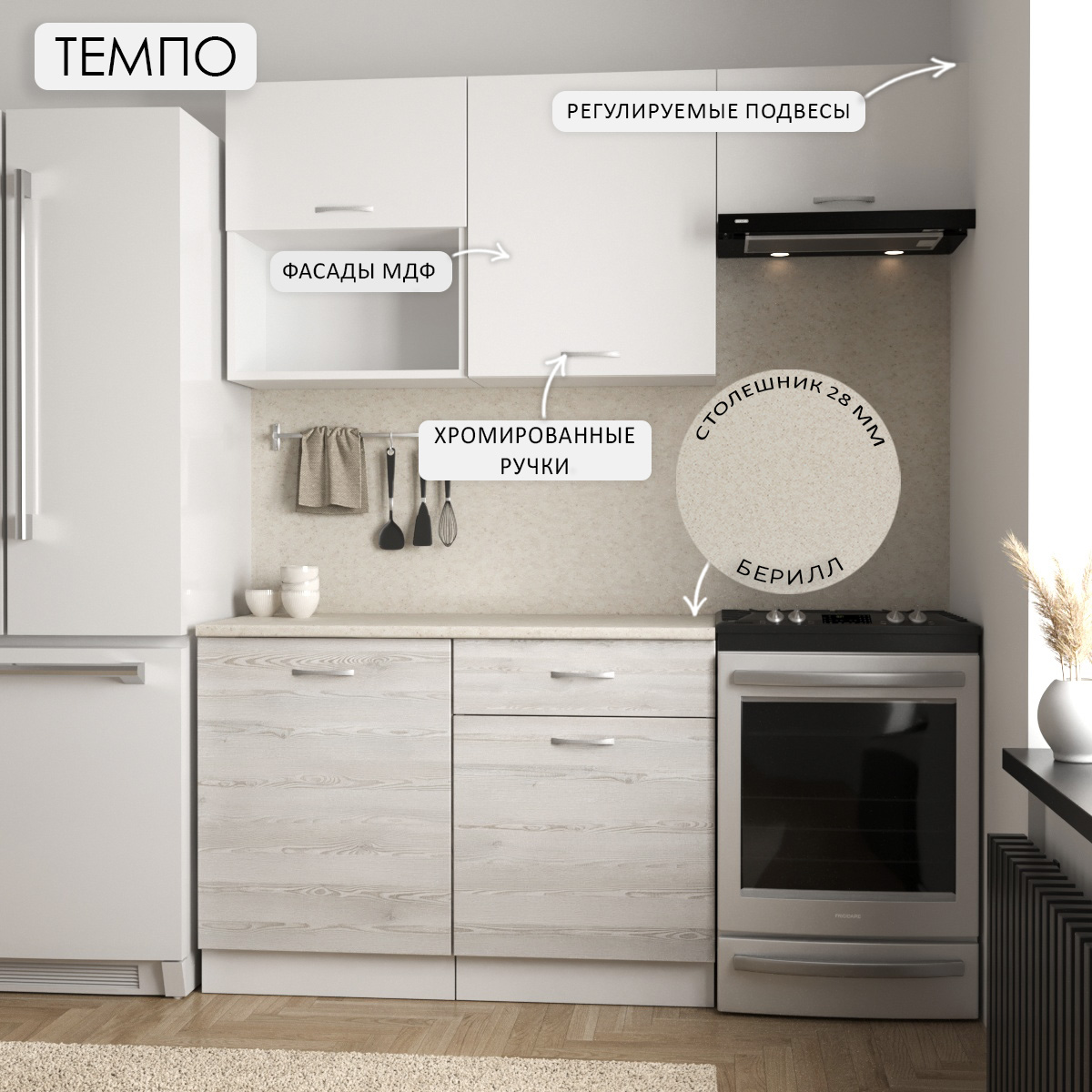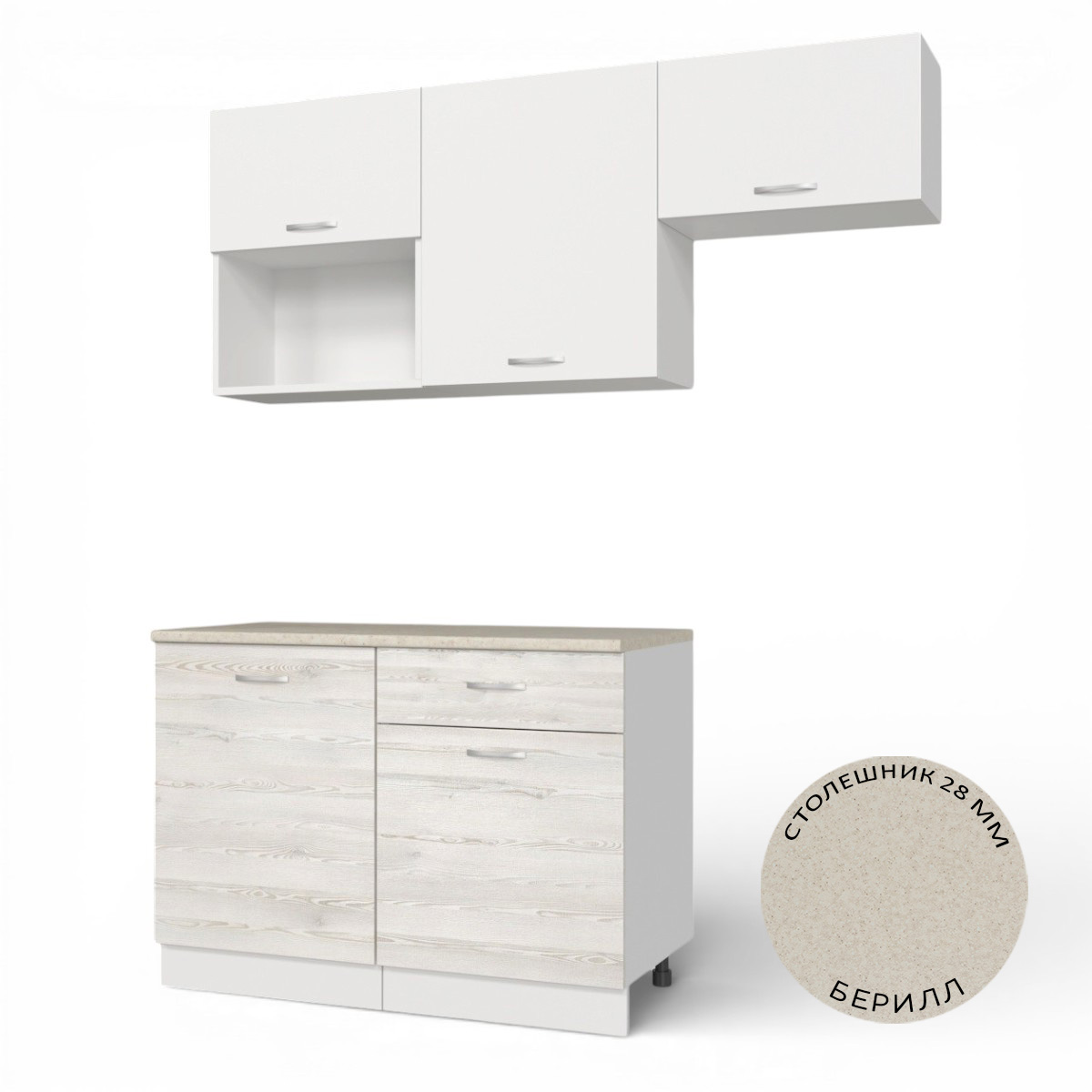 —Кухонный гарнитур Темпо №3 Белый/Сосна Лофт/Белый жемчуг/столеш. Берилл бежевый (без мойки) 1,2 м