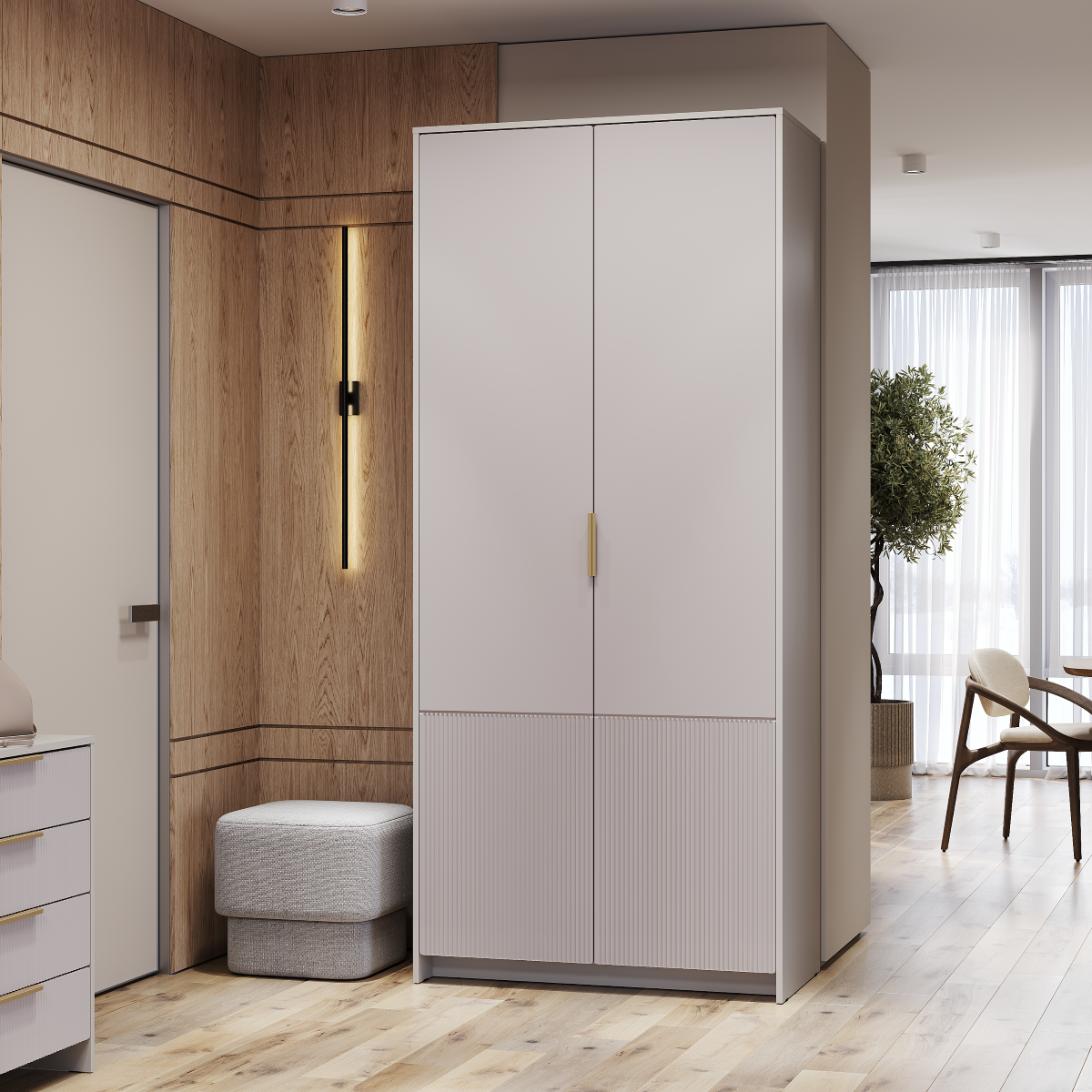 Трендовые пастельные оттенки «кашемир» и «айриш» создают спокойную и уютную атмосферу. Особую изюминку шкафу придает дизайн фасадов из МДФ: верхняя часть — гладкая и матовая, а нижняя декорирована изящной вертикальной фрезеровкой. Этот прием создает интересный визуальный контраст, структурирует пространство и подчеркивает текстуру материала.